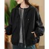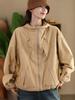 Johnature Woman Autumn Drawstring Long Sleeves Loose Casual Coat Solid Color Zipper Hooded Splicing Coat