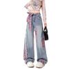 Båge Snörning Lapptäcke Jeans Dam Höstmode Amerikansk Liten Man Hög Midja Smala Lösa Vida Ben Långa Byxor