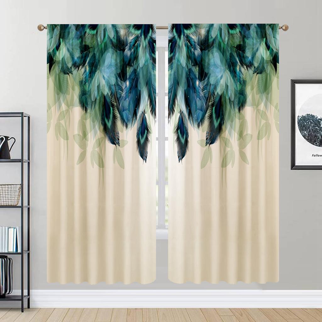 2pcs Feather Green Flowers, Study Room Kitchen Living Room Dorm Room Rod Pocket Top Window Drapes, Bedroom