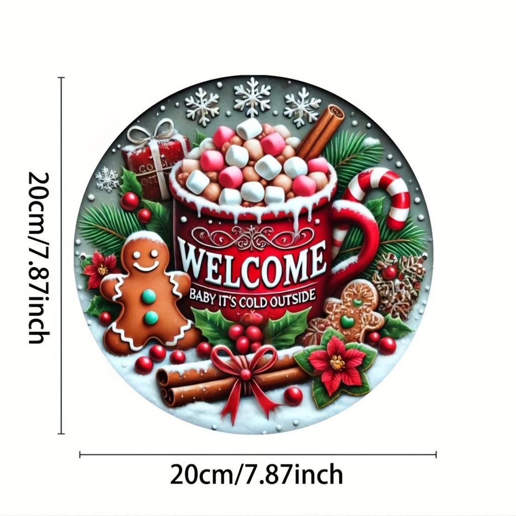 Christmas Themed Iron Wall Art Decor 7.8 Inch Round Metal Sign with Gingerbread and Holiday Mug Design Welcome Door Sign