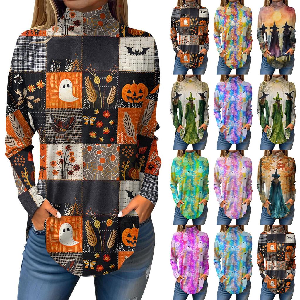 Dam Lös Höghalsad Tryckt Långärmad T-shirt Topp Pullover För Halloween