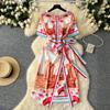 Sommar Kvinnor Designer Vintage Tryck Runway Klänning Kort Ärm Snörning Slim Bodycon Fest Pennklänningar