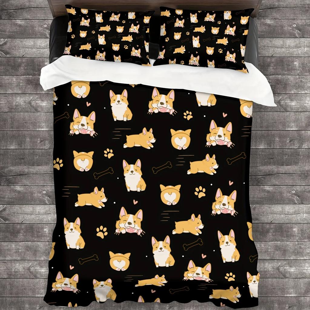Cute Corgi Bedding Set Twin Size, Cartoon Dog Paws Footprint Duvet Cover Set 3pcs For Bed Decor, Smiling Corgi Pet Comforter