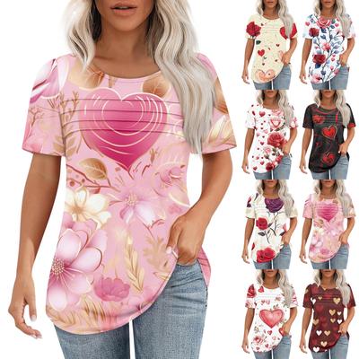 Dam Alla hjärtans dag Kärlek Hjärtmönster Kortärmad Lös Rundhals Plisserad Topp