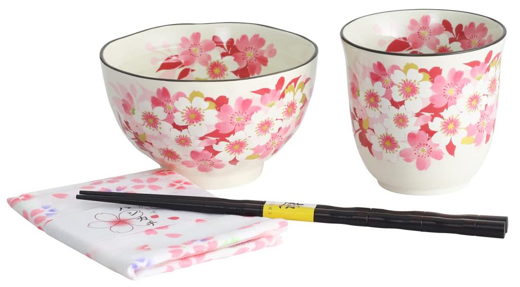 Ceramic Indigo Flower Smile Rice Bowl Tea Cup Handkerchief Gift Set 3985 Pink