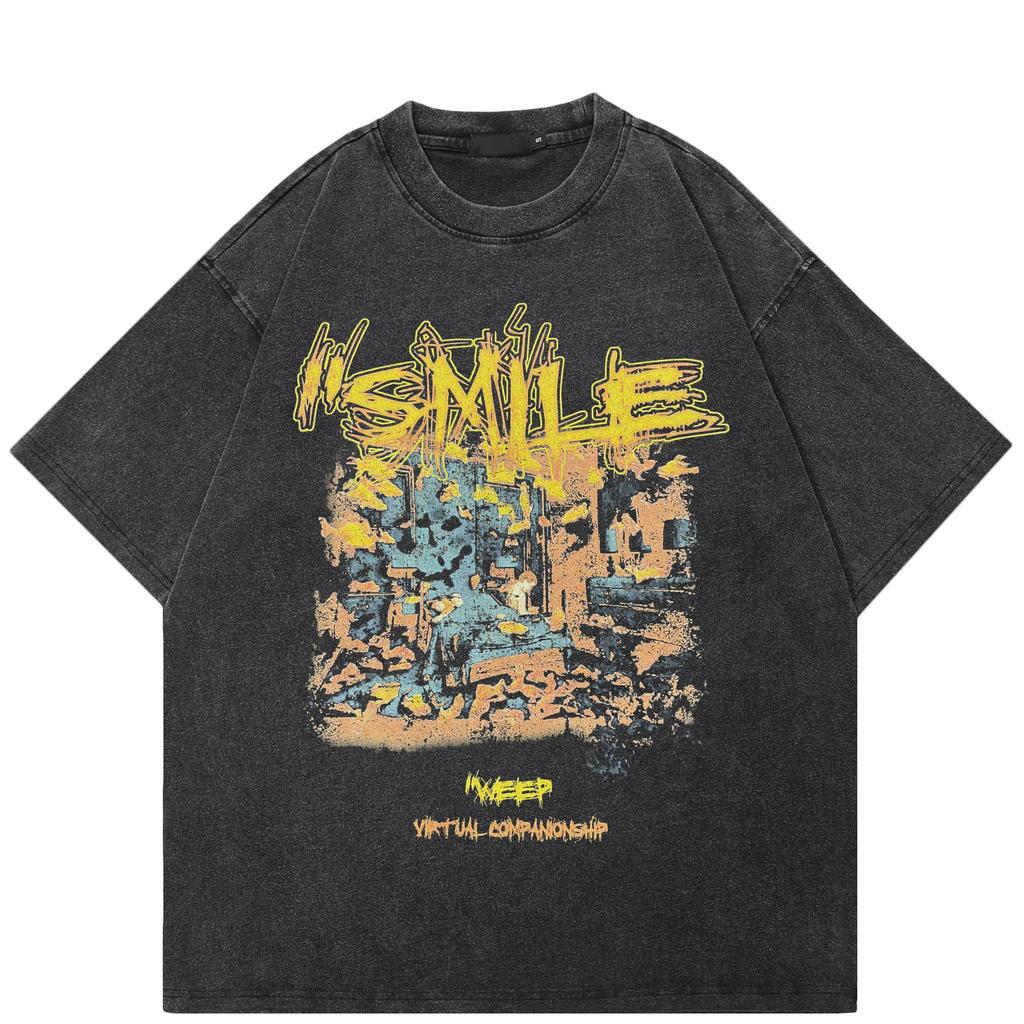 Streetwear Graffiti konst grafisk T-shirt bomull tvättad svart t-shirt Unisex oversized kortärmad t-shirt