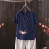Perfect for summer, this casual T-shirt features a dragonfly print that draws inspiration from European and American styles. Made from a comfortable blend of cotton and hemp, it provides a lightweight and breathable feel. The short-sleeved and V-neck design adds a touch of elegance while ensuring an easy fit. Perfect for going outside in warm weather, this T-shirt effortlessly combines style with comfort.