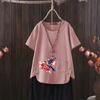 Perfect for summer, this casual T-shirt features a dragonfly print that draws inspiration from European and American styles. Made from a comfortable blend of cotton and hemp, it provides a lightweight and breathable feel. The short-sleeved and V-neck design adds a touch of elegance while ensuring an easy fit. Perfect for going outside in warm weather, this T-shirt effortlessly combines style with comfort.