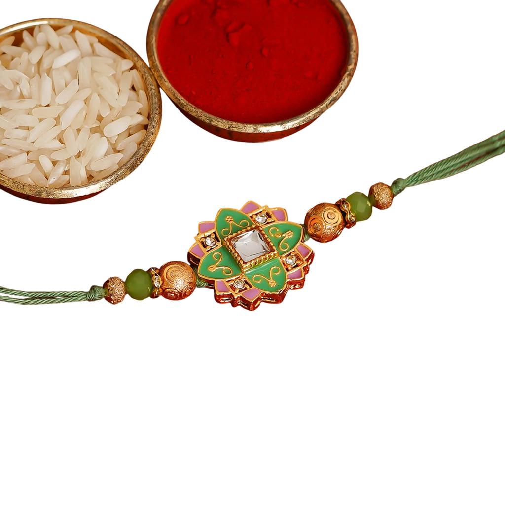 Набор (Green & Pink Meenakari Rakhi and Roli Chawal Set) – комплект из браслета, синдура и риса, имеющих важное значение в индийской культуре. Идея создания набора связана с праздником Ракшабандхан, во время которого сестры повязывают на запястья своих братьев ракхи для защиты от злых сил. Изделие способствует укреплению родственных отношений, поэтому его можно применить в качестве ценного подарка. Аксессуар выполнен в зеленом и розовом цветах, украшен бусинами и другими декоративными деталями. Синдур, включенный в комплект, подходит для пуджи и образа на этно-вечеринку, а рис используется в ходе различных религиозных ритуалов. Комплект изготовлен в лучших индийских традициях, а его элементы способны принести положительные эмоции как мужчинам, так и женщинам.