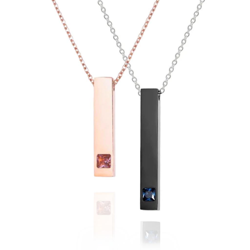 This pair accessory features a simple stick design with zirconia diamonds, and a stylish design that does not look like pair jewelry at first glance. Pair I (photo left) has a cool design with a black pendant and blue zirconia. Pair II (photo right) has a refreshing design with a rose gold pendant and pink zirconia.