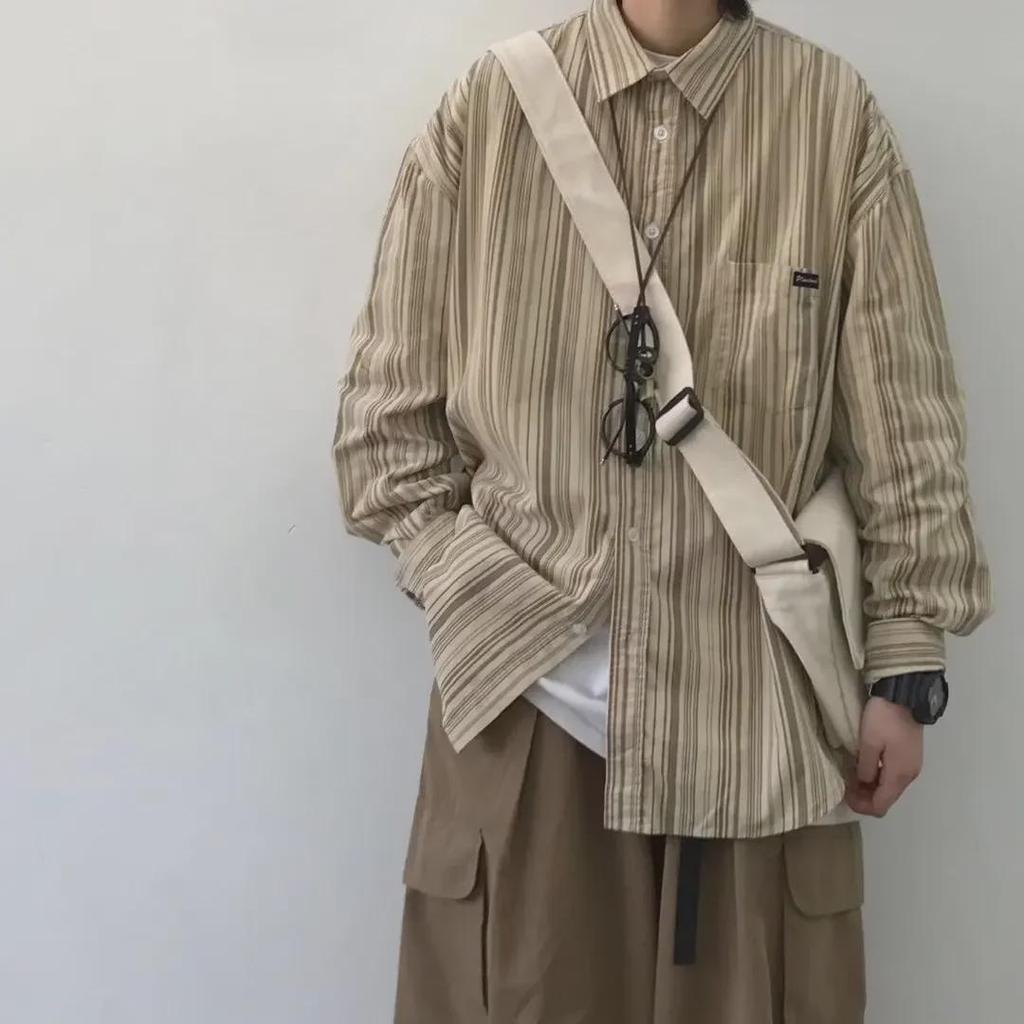 Herr Japansk Retro Randig Långärmad Skjorta - Vår/Höst, Lös Passform, Unisex Trendig Stil.