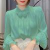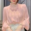 Elegant Blus med Ståkrage och Veck Damkläder Enfärgad Vår Höst Chic Blommig Tredimensionell Dekoration Skjorta
