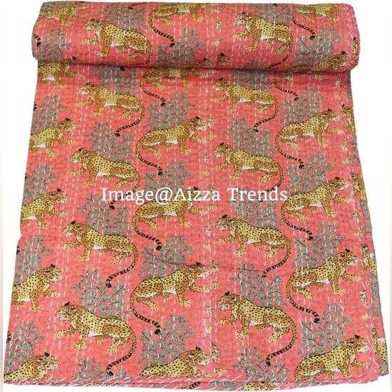 Aizza Trends Handmade Pure Cotton Tiger Print Kantha Quilt - Traditional Look Bed Spread Kantha Gudri - Vintage Hand Stitch Gudri