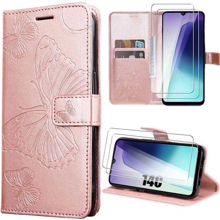 Coque Antichoc - E.F.Connection - pour Xiaomi Redmi 14C - Simili cuir rose - Motif papillon - Antichoc - avec 2 Verres Trempés