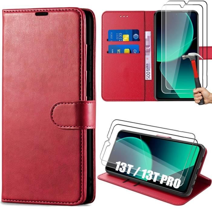 Coque pour Xiaomi 13T - Xiaomi - Etui Antichoc Cuir PU Rouge - Porte-Cartes - 2 Verres Trempés