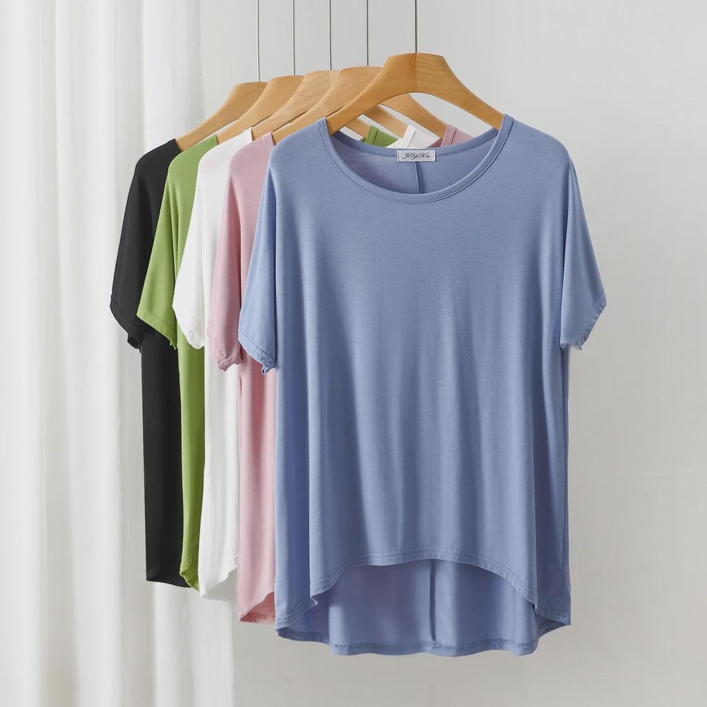 Sommar Lös Passform Modal T-shirt: Kort fram, lång bak, Plusstorlek Fladdermusärm
