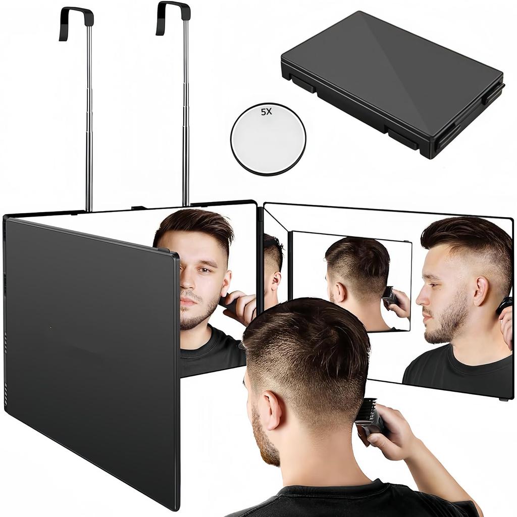 [Perfect Mirror] Set includes: 3-sided mirror x1, 5x magnifying mirror x1. Three-sided mirror with 360 degree rotation design, allows you to comfortably see your head and face from all angles, creating the perfect makeup. It has a variety of uses, such as hair cutting, makeup, hair dyeing, pigtail braiding, hair trimming, etc. It is a versatile product that can be used on a tabletop or when doing makeup or hair styling while sitting.