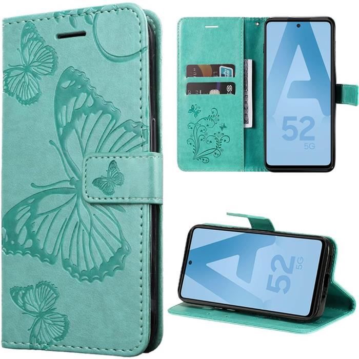 Coque de protection - BOOLING - pour Samsung Galaxy A52s 5G - Motif Papillon - Synthécuir Vert - Semi-rigide