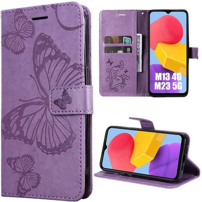 Skal för Samsung Galaxy M23 5G-M13 4G, Flipfodral Syntetiskt Läder Lila med Elegant Chic Fjärilsmönster