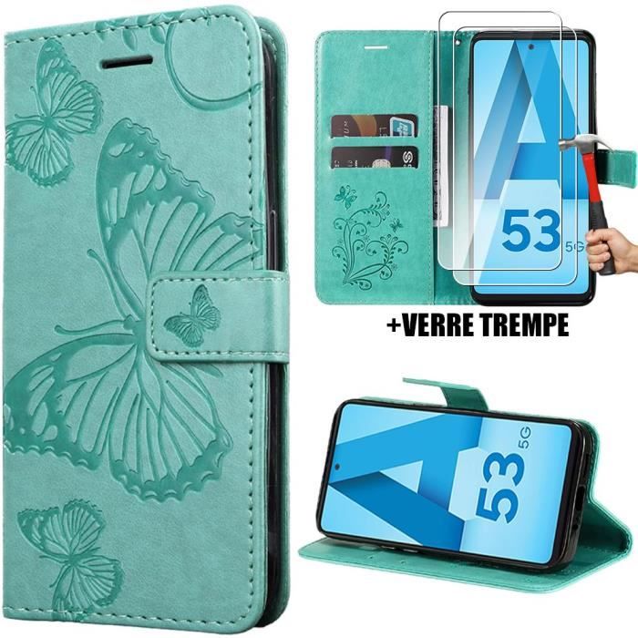 Coque - Booling - pour Samsung Galaxy A53 5G - Cuir PU Vert - Motif Papillon - 2 Verres Trempés 9H