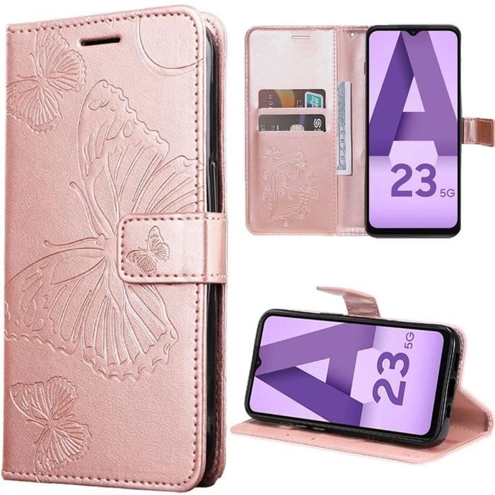 Coque de protection - BOOLING - pour Samsung Galaxy A23 5G - Rose - Papillon - Antichoc avec rabat magnétique