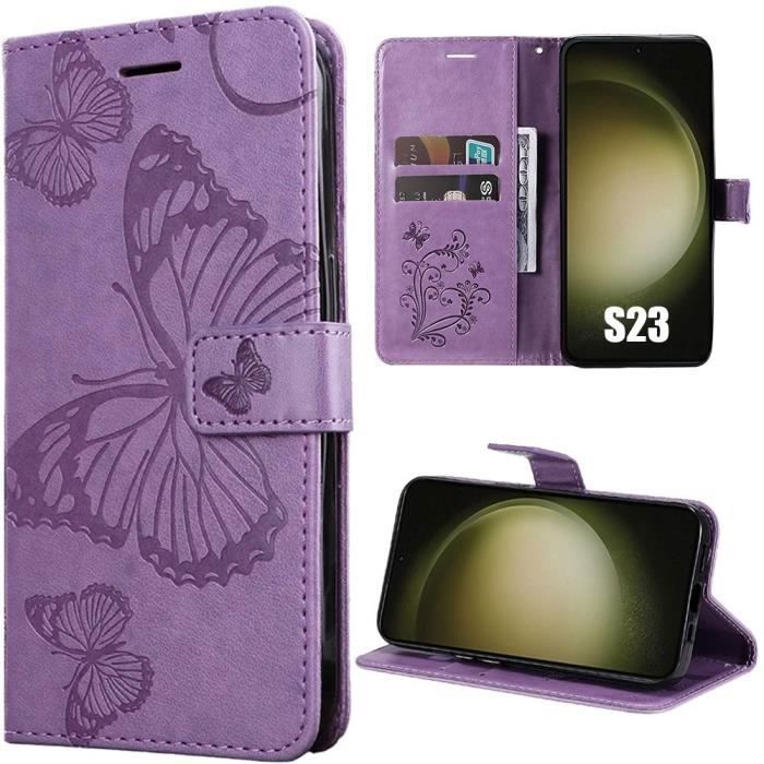 Skal - Booling - för Samsung Galaxy S23 - Syntetiskt läder - Fjärilsmönster - Lila