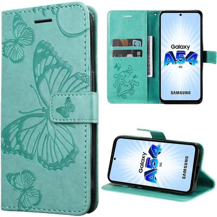 Coque - BOOLING - pour Samsung Galaxy A54 5G - Effet Cuir Vert - Motif Papillon - Fermeture Magnétique