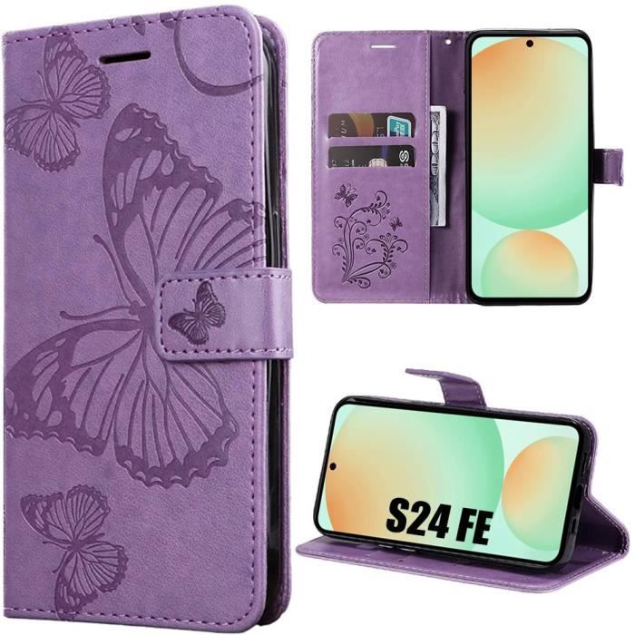 Coque - BOOLING - pour Samsung Galaxy S24 FE - Antichoc - Effet Cuir - Motif Papillon Violet