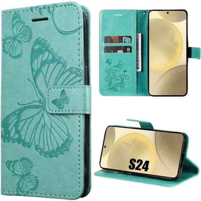Coque de protection - Booling - pour Samsung Galaxy S24 - Vert - Cuir PU - Motif Papillon