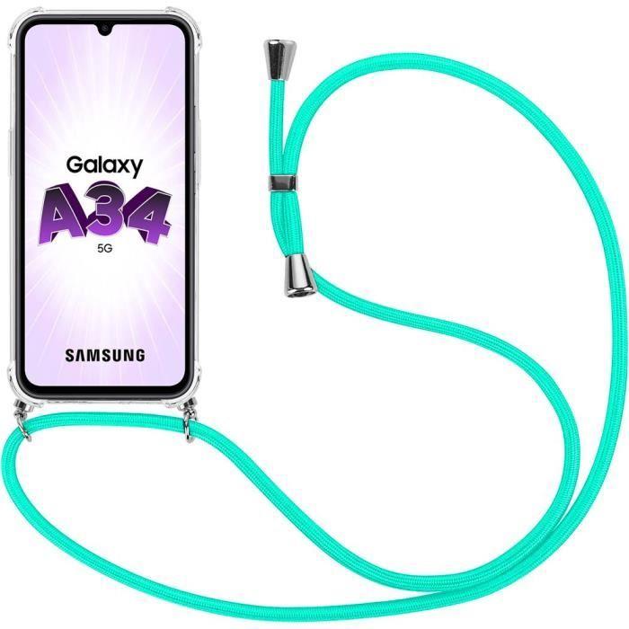 Coque Cordon pour Samsung Galaxy A34 5G - AntiChoc Coins Renforcés Souple avec Cordon Turquoise