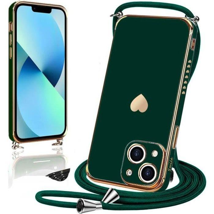 Coque Bandoulière - Luxe - pour iPhone 13 - Vert nuit - Motif coeur - Antichoc TPU Souple