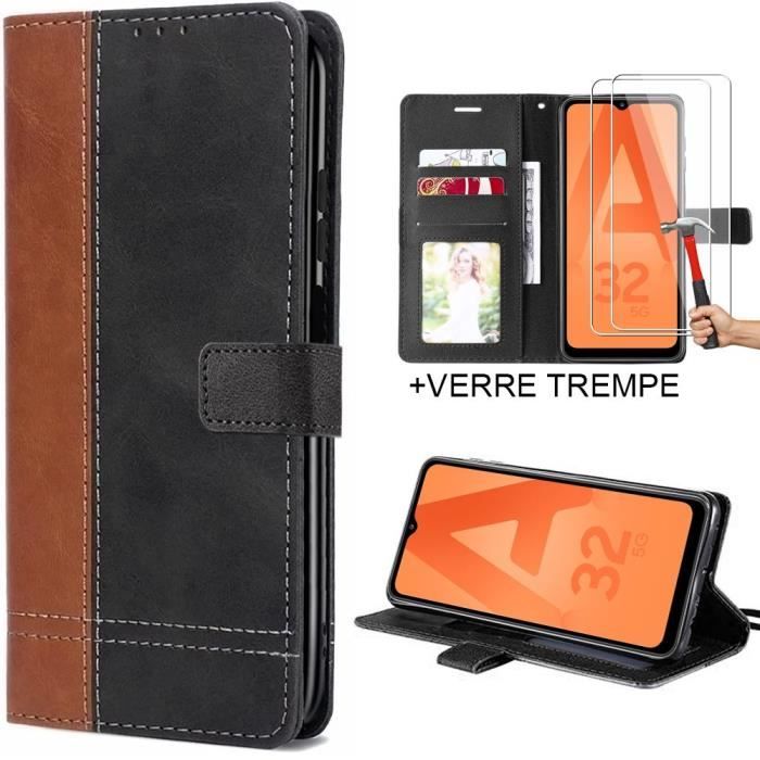 2 Verres Trempés+ Coque pour Samsung A32 5G - Anti-Rayures Effet Cuir Marron Bicolore