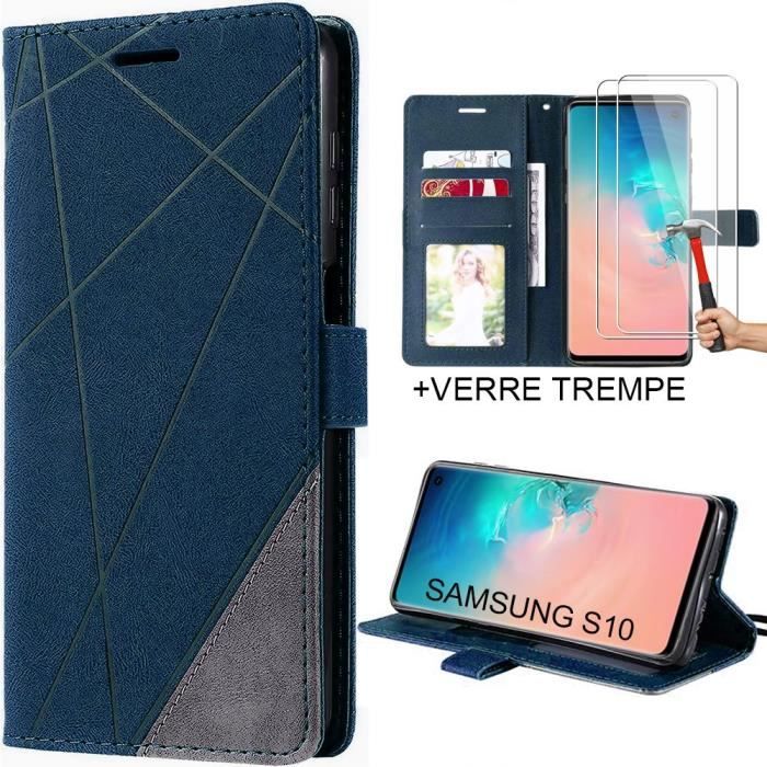 Coque Rabat pour Samsung Galaxy S10, Protection Synthécuir Bleu Marine et 2 Verres Trempés