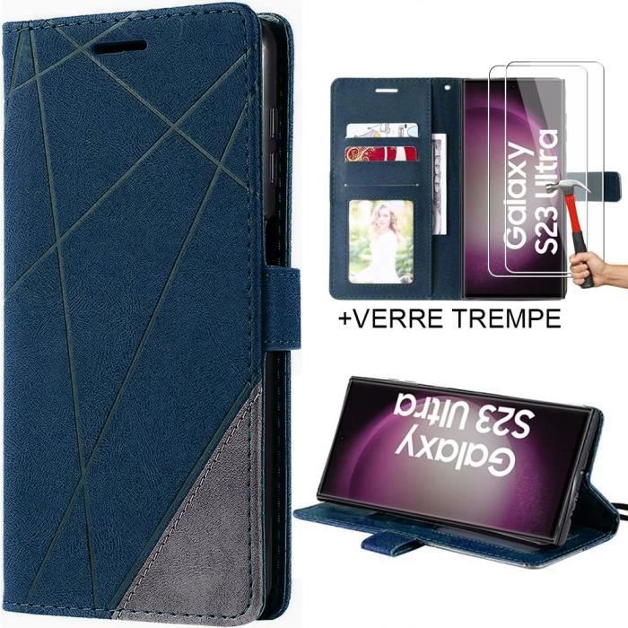 Pack de 2 Verres Trempés avec Coque pour Samsung S23 Ultra - Flip Case Cuir PU Bleu Marine