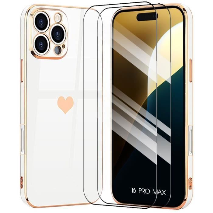 Coque de protection - BOOLING - pour iPhone 16 Pro Max - Silicone Blanc - Motif Cœur - Bordures Dorées