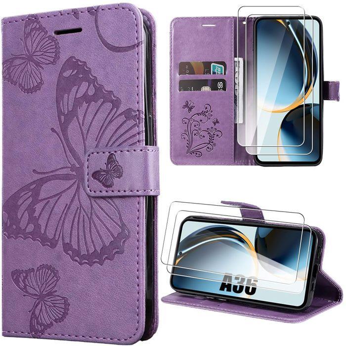 Skal - BOOLING - för Samsung Galaxy A36 5G - Fjärilsmönster Lila Lädereffekt - 2 Härdat glas
