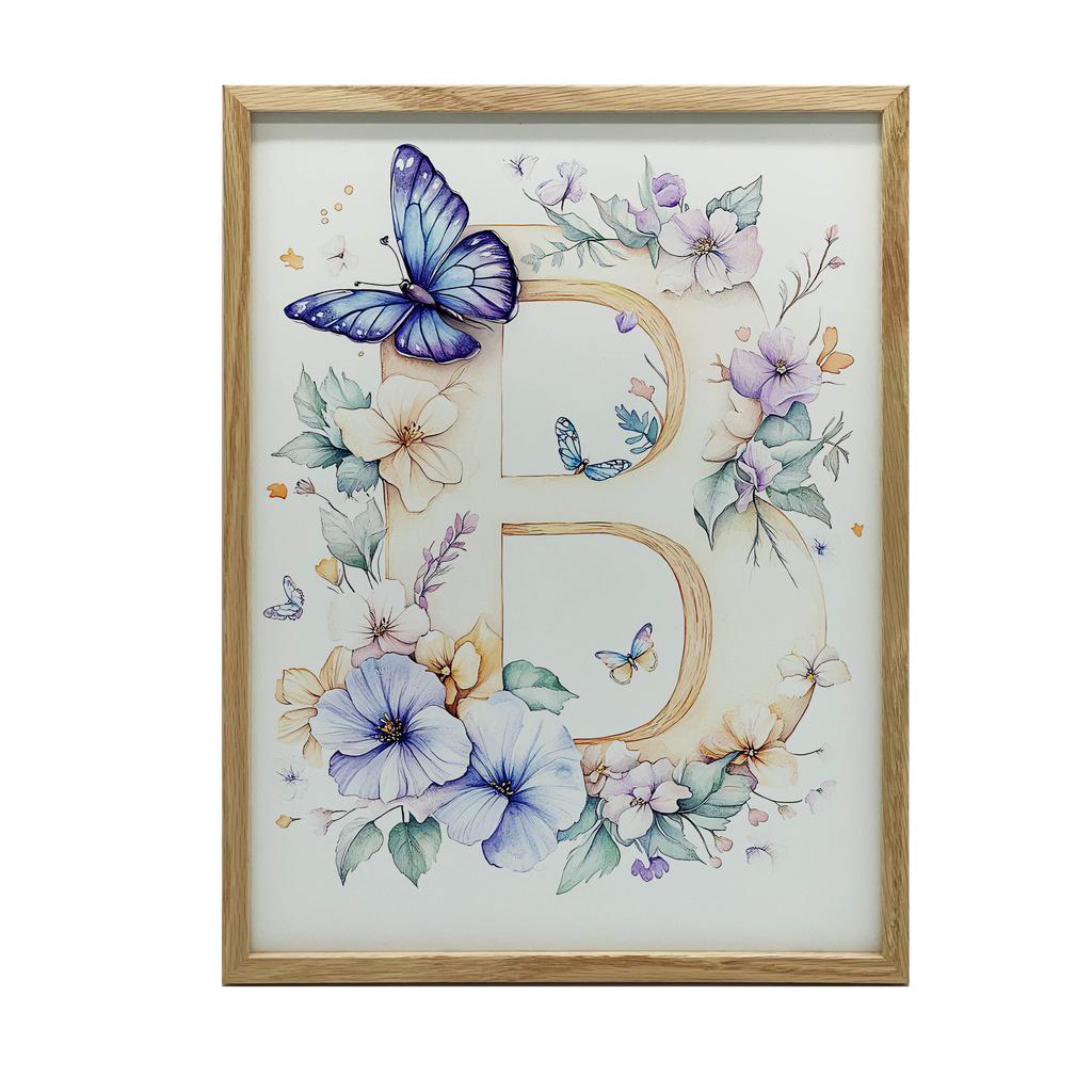 1x Plakat ""B"" w kwiaty i motyle, 30x40 cm, rama drewniana ciemny brąz, papier matowy 230 gsm