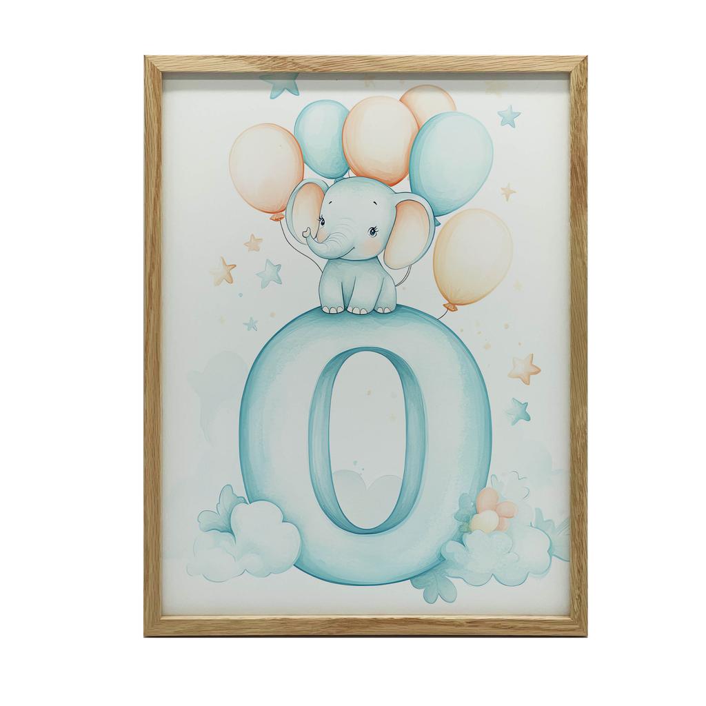 1x Plakat Słonik na chmurze z literą O, 50x70 cm, rama aluminiowa złota, papier matowy 230 gsm