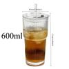 Ribbed Glass Cups with Lids Straws Large 600ml Juice Coffee Tumblers, Stackable Dishwasher Safe Modern Glasses for Home Office