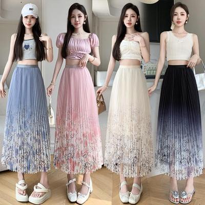 Blommig Halvlång Kjol för Kvinnor Vår/Sommar Lång Stil Hög Midja Retro Elastisk Lång Längd Kjol