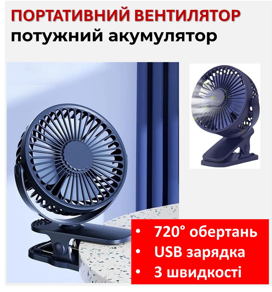 Портативный мини-вентилятор с мощным аккумулятором | USB, 3 скорости | 720° ручная регулировка | С зажимом