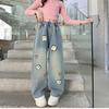 Trendiga jeans för flickor med vår- och höstbroderi, byxor med vida ben, lösa och lediga raka byxor