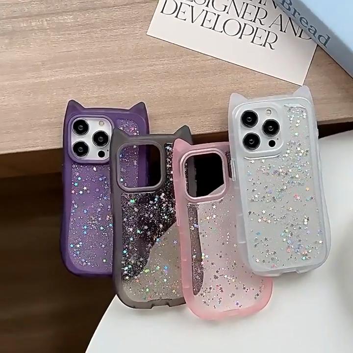 Sött tecknat kattöron glitter paljetter transparent skal för iPhone 16 15 Plus 14 Pro Max 13 12 11 mjukt silikon stötsäkert skydd