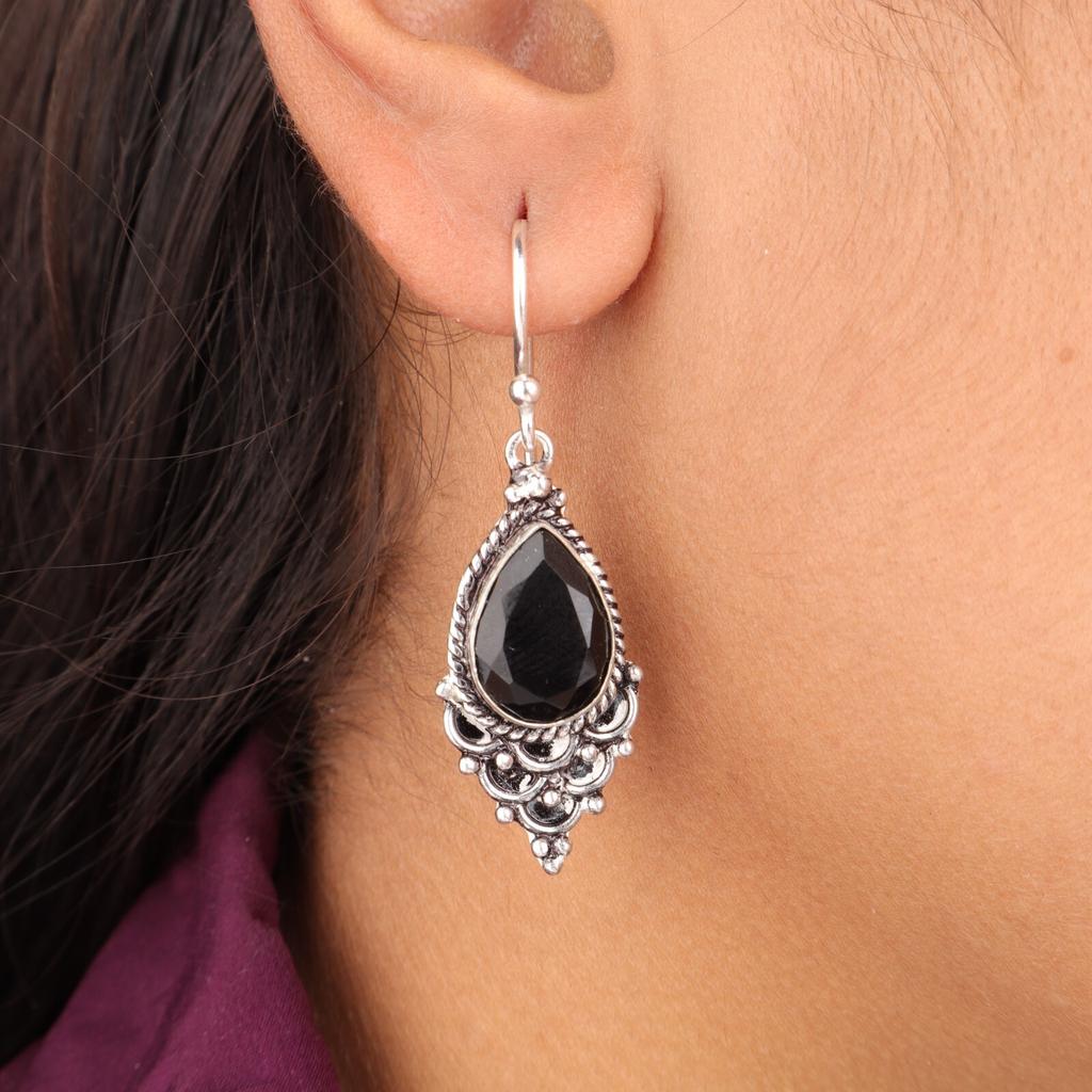Naturlig Svart Onyx Ädelsten 925 Sterlingsilver Smycken Handgjorda Örhängen 1,9" EE-85-13