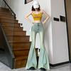 Lyft din garderob med dessa snygga Retro Hög Midja Fishtail Flare Jeans, designade för en modemedveten look.. Dessa jeans är tillverkade av högkvalitativ denim och erbjuder en bekväm passform samt en smalnande effekt tack vare sitt elastiska tyg.. Med en elegant hög midja är dessa golvlånga byxor prydda med iögonfallande paljetter, vilket ger en touch av glamour till vilken outfit som helst.. Den vida benmodellen ger en djärv, retroestetik som är perfekt för att sticka ut.. Oavsett om du klär upp dig eller kör en avslappnad stil, är dessa jeans ett mångsidigt tillskott till varje modeintresserads samling.