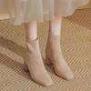 Nude höga klackar Franska tjocka klackar korta stövlar damens nya höststövlar mocka fyrkantig klack höga klackstövlar nude stövlar dam