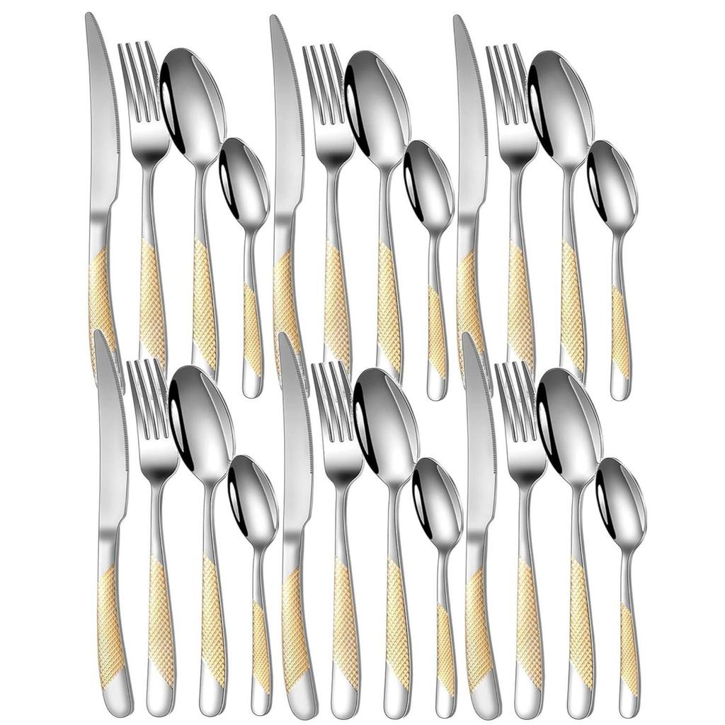 Spegelpolerad Guldpläterad Rostfritt Stål Bestickset - Koppar Bestick Roséguld Bestick [Middagsgaffel, Tesked, Salladssked, Kniv] (Guldprick, 24 stycken)