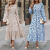 Mode Damklänningar Eleganta Blommiga V-ringade Långärmade Midjerade Volang A-linjeklänningar
