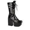 Plusstorlek fyrkantig tå ultrahöga platå metallpunkstövlar med mellanhöga rör och korsband i dragkedjan för damstövlar