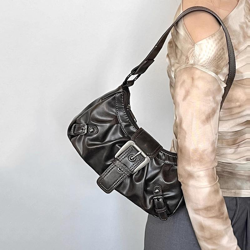 Yogodlns Retro Plisserad Axelväska Mode Maillard Hot Girl Underarmsväska Läder Punk Motorcykelväska Kvinnor Vardagliga Hoboväskor